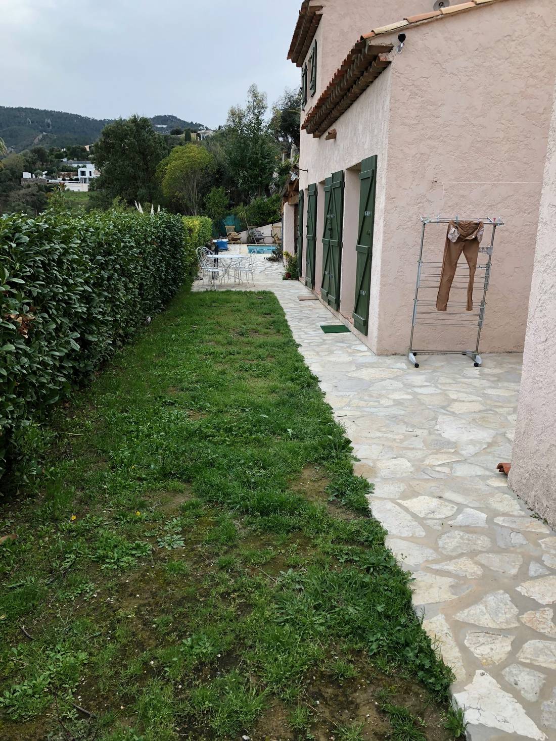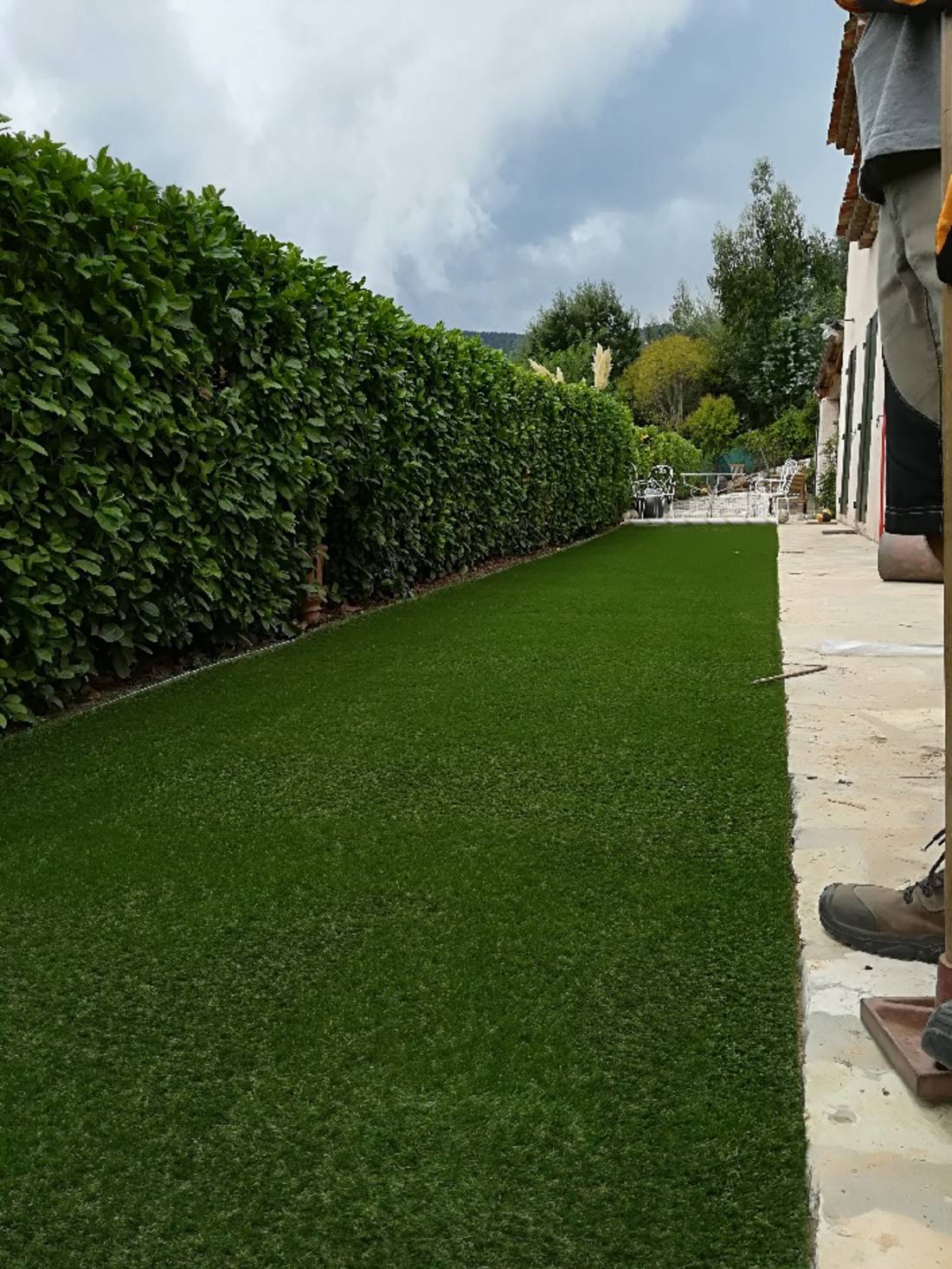 La haie de lauriers a été remplacé par une haie de pittosporum et tout le long du grillage un brise vue a été posé.