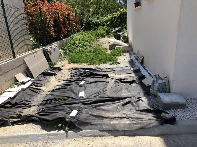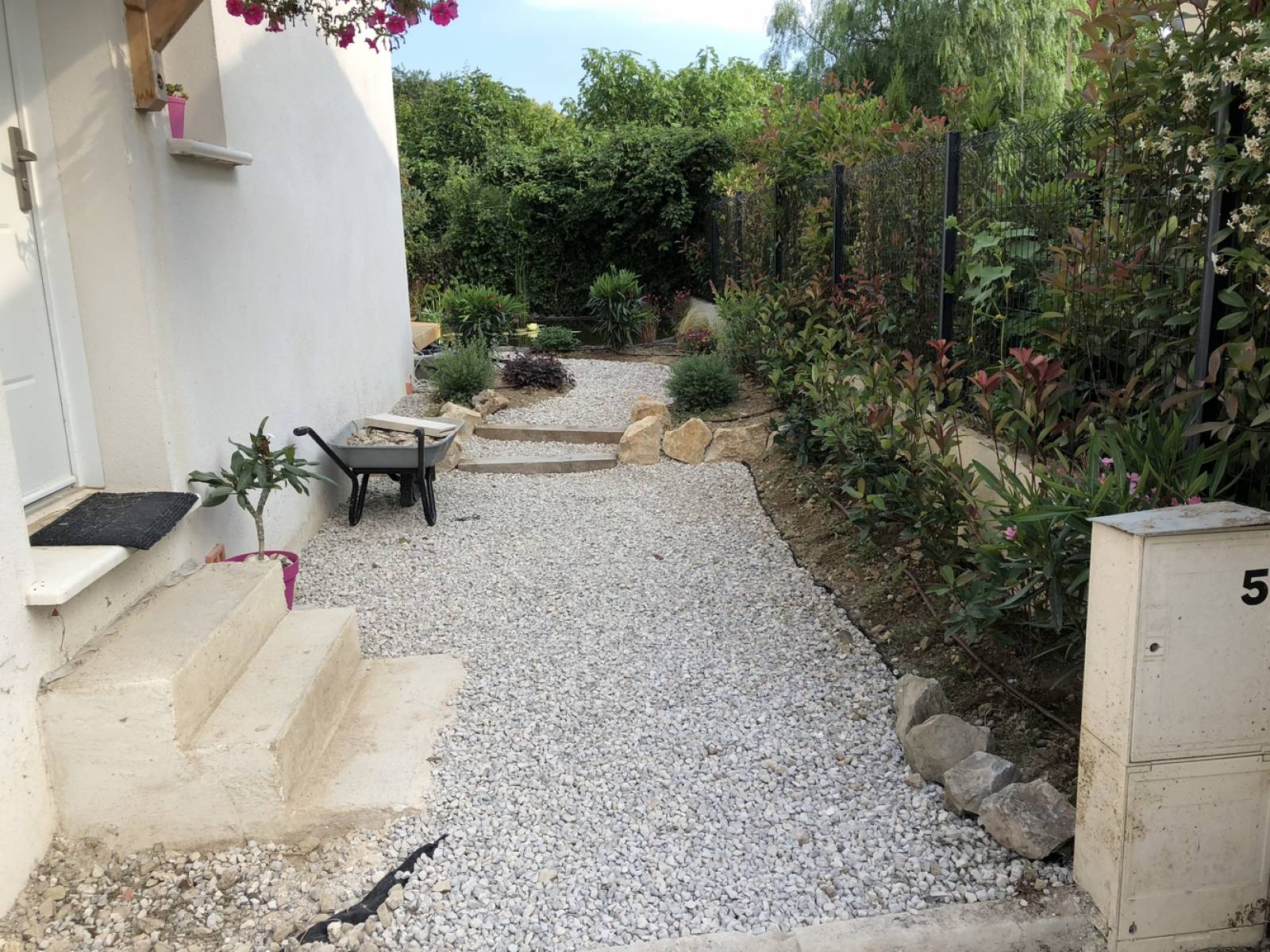 La dernière zone est celle située sur le côté et qui donne sur l’entrée principale de la maison. Réalisation d’un chemin simple et de deux bordures de plantation.