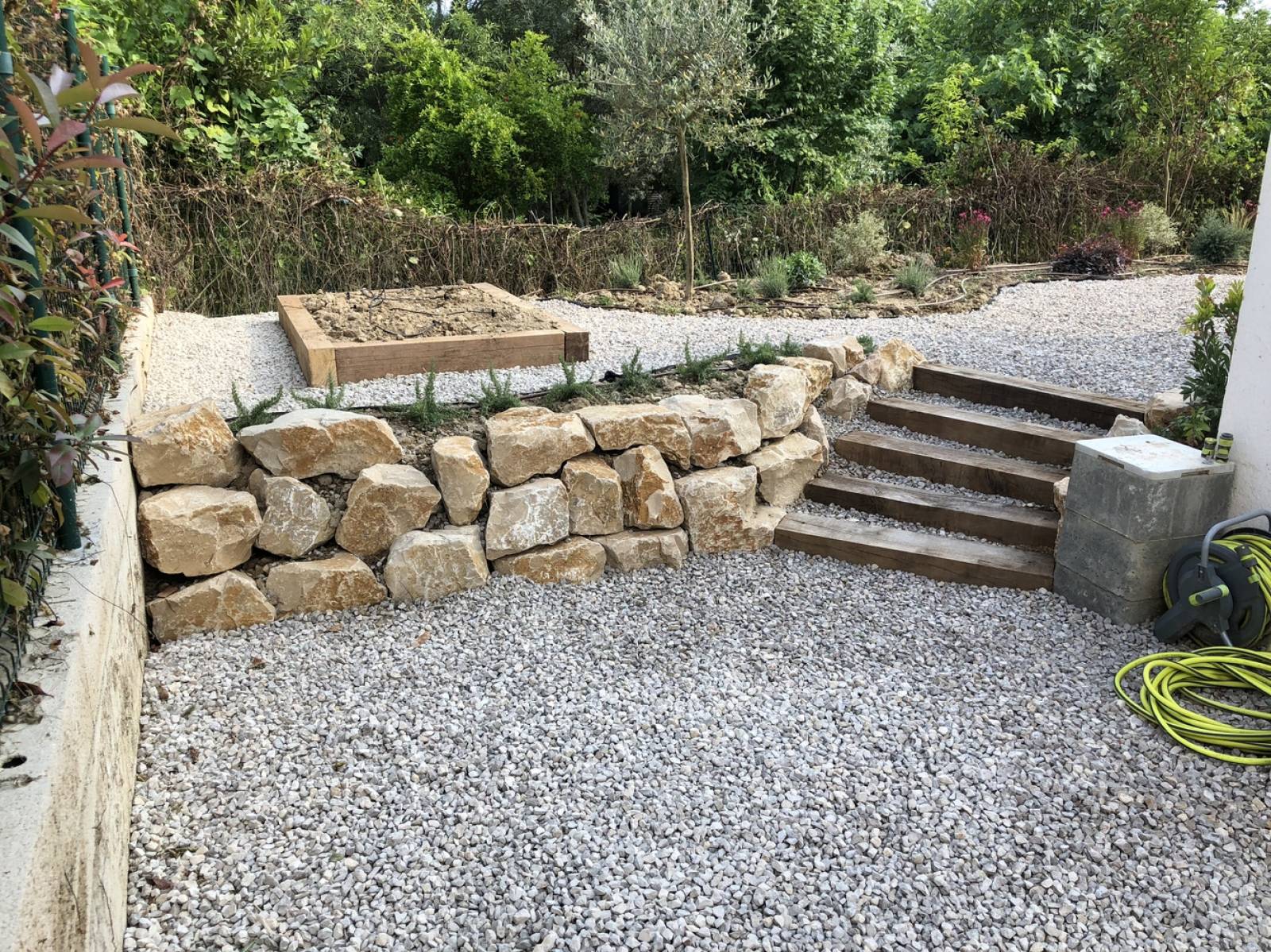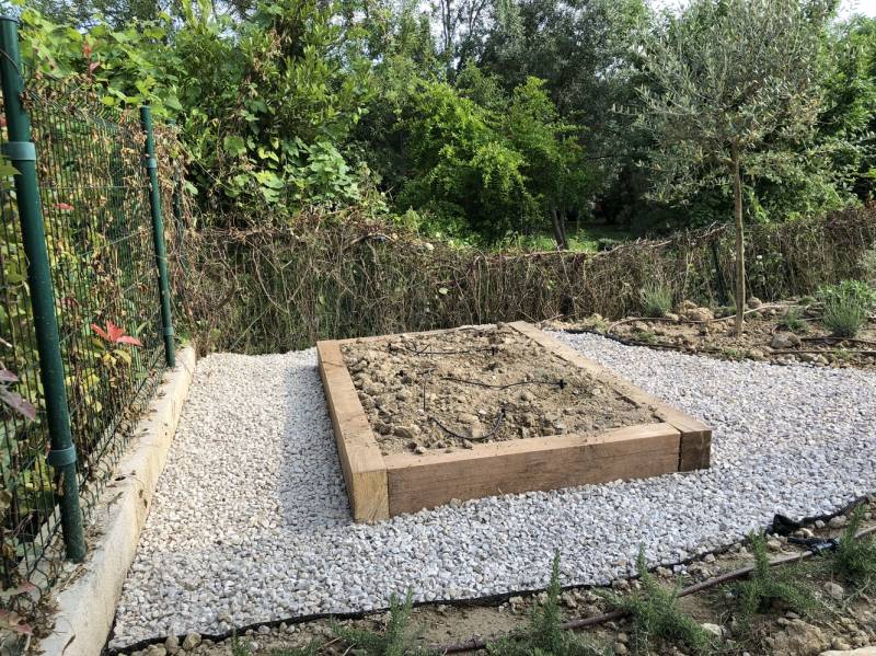 Pour le tour du potager, nous avons mis en place des gravillons suite à la demande des clients pour un minimum d’entretien.