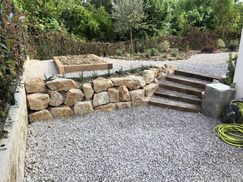 La meilleur façon de séparer cette zone avec le reste du jardin est de faire en sorte que le reste du jardin soit plus haut et accessible par trois marches réalisées avec des poutres de chemin de fer.