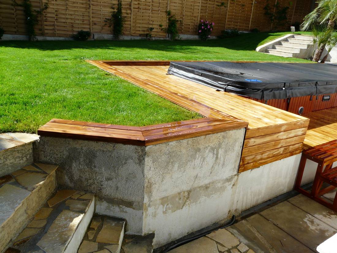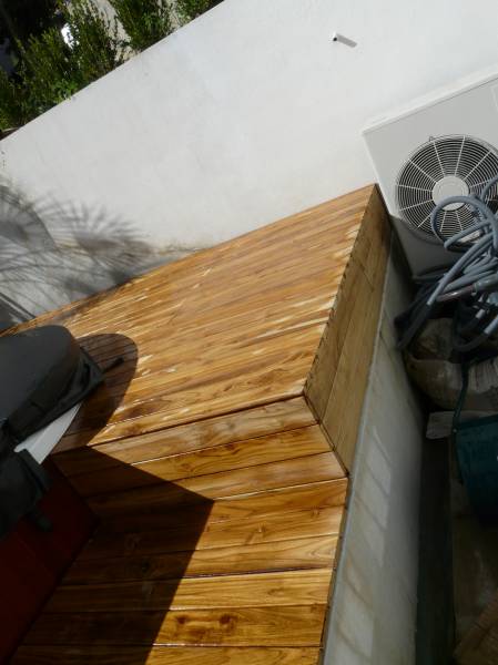 Pour cette réalisation, nous avons utilisé du teck avec un système de clips et de vis, assurant un maintien solide tout en garantissant un aspect propre et raffiné. L'habillage du bois a été réalisé avec une grande attention aux détails : aucune vis n'est apparente, offrant ainsi une surface parfaitement lisse et esthétique. Ce souci du détail donne un rendu haut de gamme tout en assurant la sécurité, notamment pour les pieds nus des utilisateurs.
