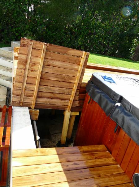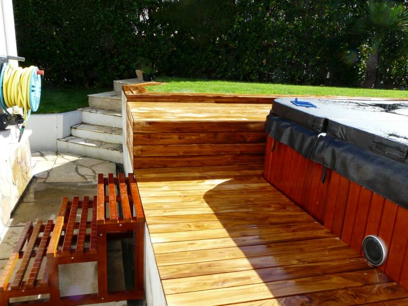 L’aménagement de cette terrasse en teck a été soigneusement conçu pour entourer une piscine, avec un coffrage spécialement intégré pour permettre un accès facile au système de pompe et d’entretien de la piscine. Ce coffrage discret assure une accessibilité simple sans compromettre l'esthétique globale de l’installation.