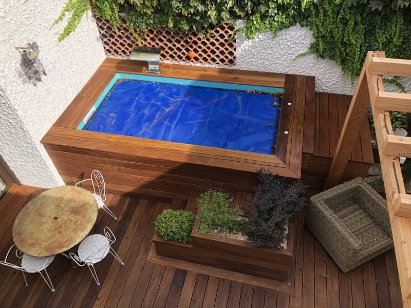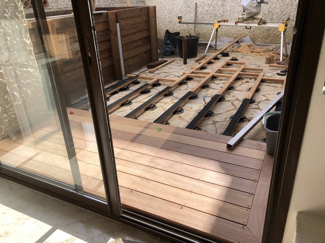 La réalisation de cette terrasse est faite en bois exotique "lames de cumuru "d'environ 40m2 avec la création d'une pergola avec les mêmes lames de cumaru en prolongement de la piscine extérieure.