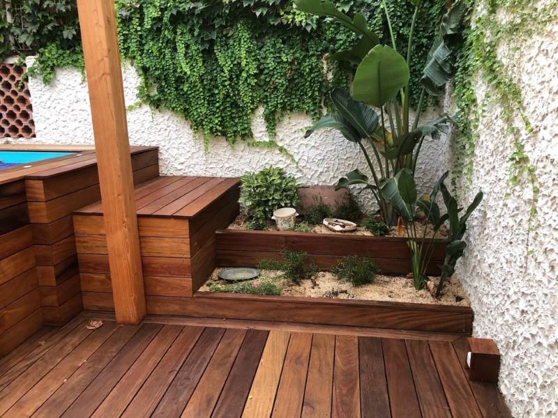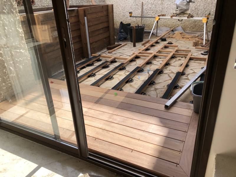 Bocca Jardins, paysagiste à Cannes, réalise une terrasse en bois exotique "Cumaru" ainsi qu'une pergola pour une superficie de 40 m2 pour une maison individuelle sur Cannes pour un particulier.