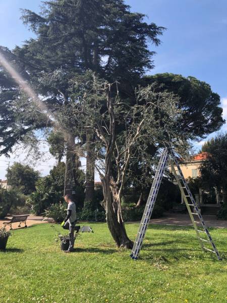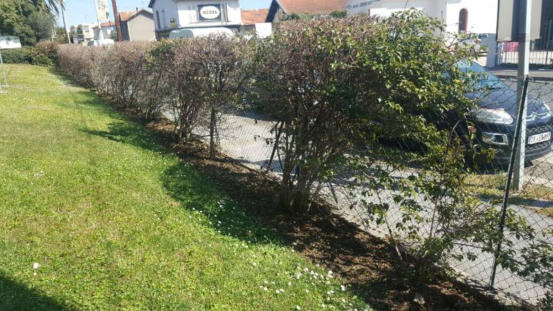 Nous sommes à la charge de l'entretien de la pelouse, de la taille des différents buissonnants, de la taille des oliviers, de la taille d'une glycine, de l'entretien des allées, de la taille de lauriers roses, de la taille de rosiers dans le respect de cet environnement.
