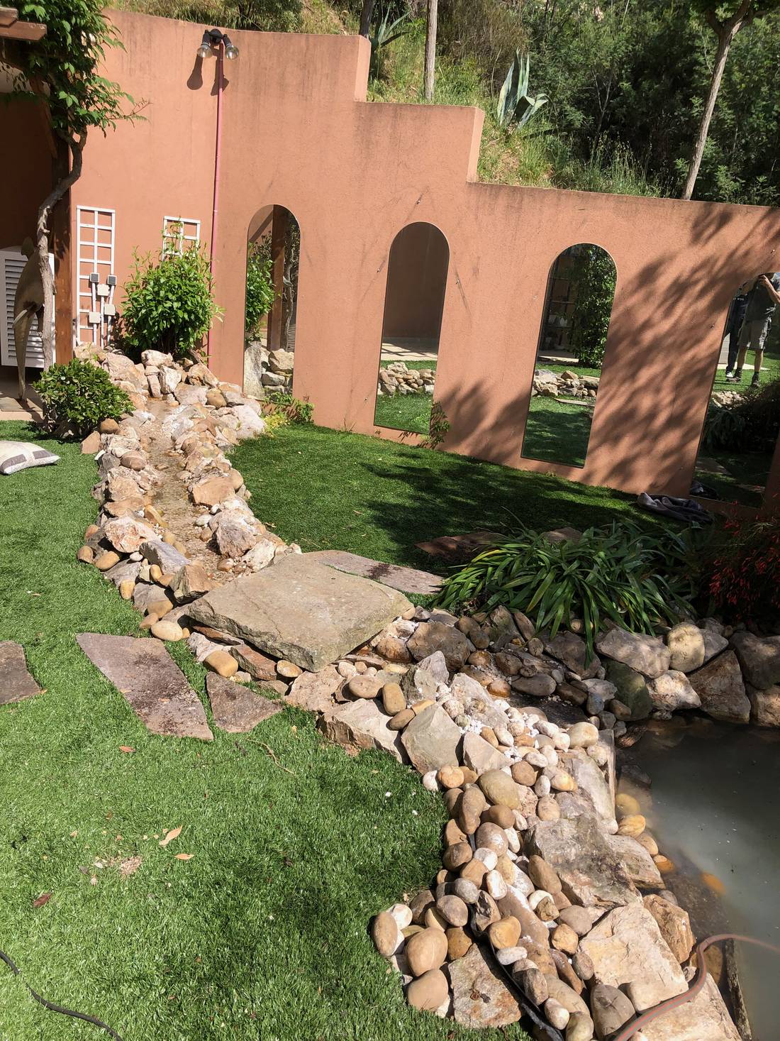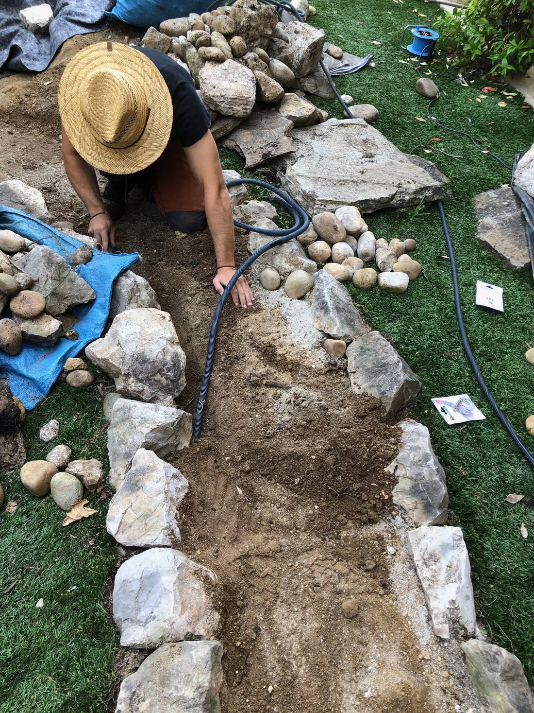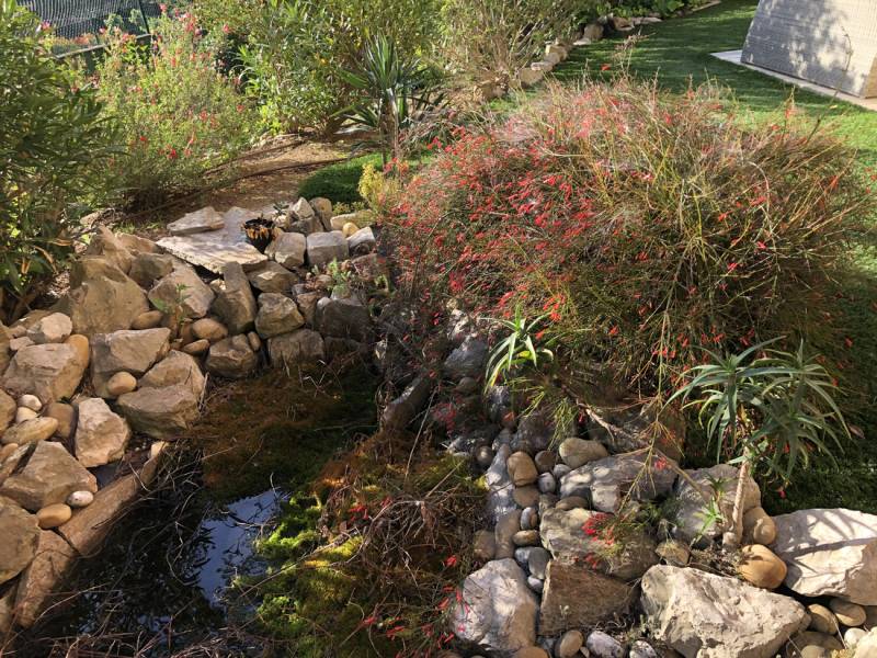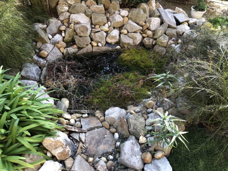 Bocca Jardins après avoir effectué les réparations du bassin et le changement du liner par un EPDM, remet en place l'ancien liner, repose par dessus celui-ci l'EPDM, remet l'ensemble des plantes et pierres ainsi que le système de pompe pour remettre le bassin en route.