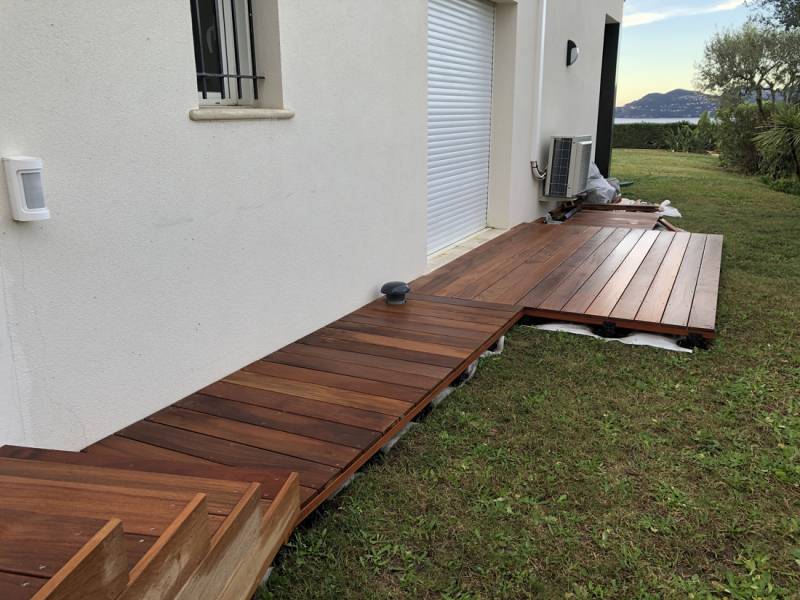 Afin d’assurer une longue durée de vie à cette terrasse en bois exotique, un entretien régulier est recommandé. Grâce à l'application d'un saturateur, ce bois conservera sa teinte naturelle tout en étant protégé des intempéries et des UV. Avec les soins appropriés, cette terrasse aura une durée de vie supérieure à 15 ans, offrant ainsi une solution à la fois esthétique et durable pour profiter pleinement des espaces extérieurs.