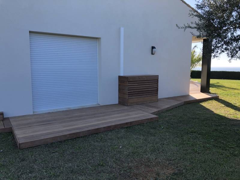 Grâce à l'utilisation de bois exotique, reconnu pour sa durabilité et sa résistance, cette terrasse est non seulement un espace de vie esthétique, mais aussi une structure solide et pérenne. Le bois exotique offre une teinte chaleureuse et une texture unique qui se marie parfaitement avec les jardins méditerranéens et les piscines.