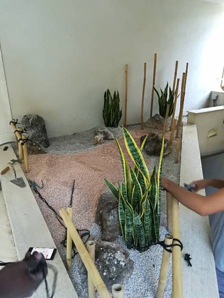 Le style du jardin a été réalisées dans les deux jardinières. Seul la disposition des pierres et des bambous du fond ont changé légèrement pour s'adapter à la jardinière.