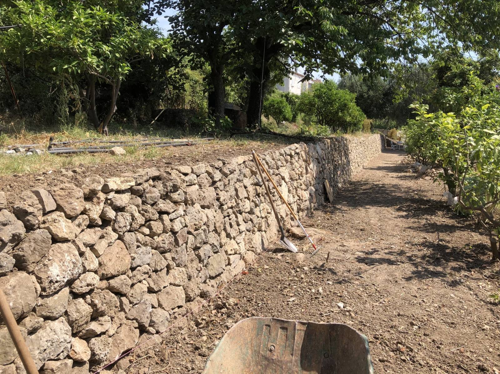 Pour cela, Bocca Jardins doit démonter l'ancien mur en pierre au moyen d'une mini-pelle.