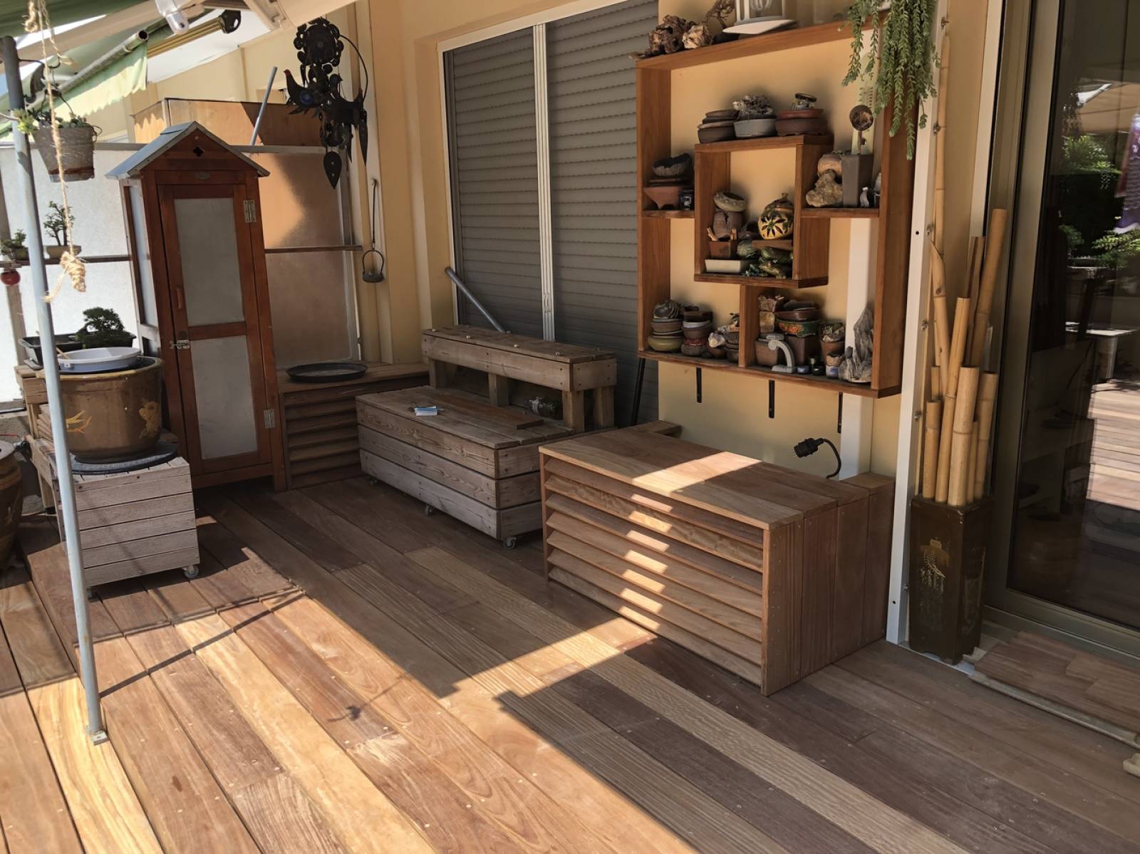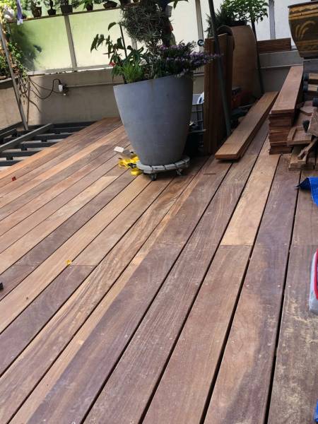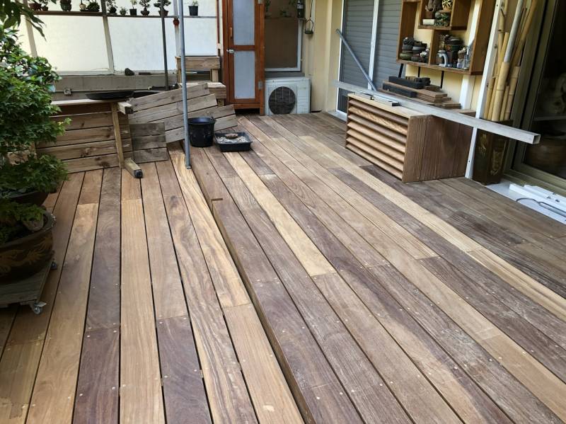 Après la création du jardin japonais, de la création d'un Tsukubaï, voici la création de la terrasse en bois exotique sur deux niveaux en bois cumaru de couleur foncée, les trappes sont cachées et accessible de façon à nettoyer le dessous de la terrasse pour ne pas accumuler d'impureté.